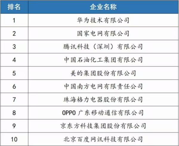 中国企业专利创新百强榜TOP10